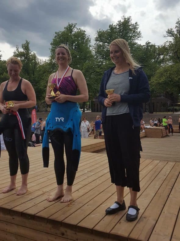 Camilla om loppet: Det var ett tufft lopp! Jag låg och fajtades med Ulrika hela vägen. Hon var en tuff nöt att knäcka. Körde verkligen på gränsen hela tiden, men hittade ett par fötter i killen som kom tvåa och sög mig fast. Han var rätt onöjd med att bli omspurtad i slutet. Det var väldigt varmt i vattnet. Hela 22 grader vilket gjorde loppet tuffare för man kokade i våtdräkten och 5000 m är rätt långt.