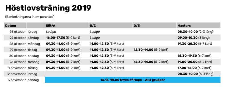 Nu är schemat för höstlovsträningen lagt, klicka på bilden nedan för större storlek. Höstlovet infaller vecka 44 och avslutas med Swim of Hope för alla grupper, söndagen den 3 november.