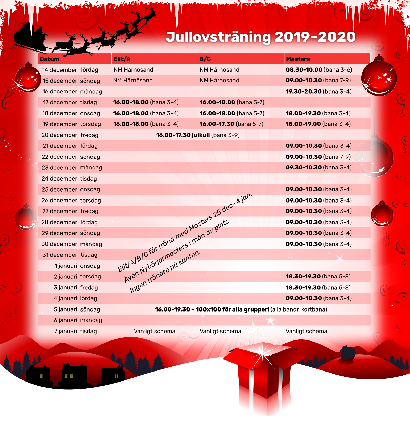 Under julen kommer Mastersgruppen som vanligt att köra på. Och för de simmare i Elit/A/B/C som är sugna på att vara med är man välkommen på Masters träningar från den 25 december. Det är ingen tränare på kanten så vi hjälps åt att skriva passen. I mån av plats är även Nybörjarmasters välkomna!