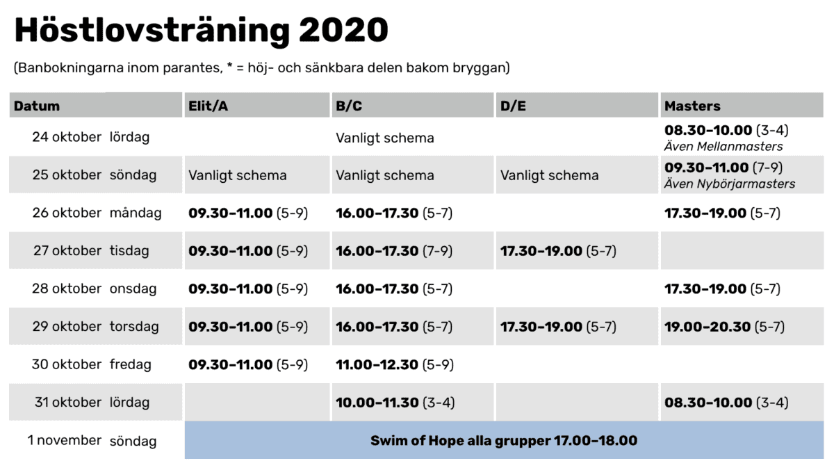 Höstlovet vecka 44 närmar sig och då blir det höstlovsträning för våra tävlingsgrupper i simning.